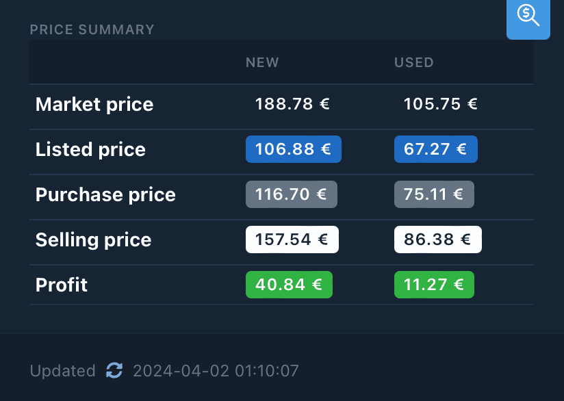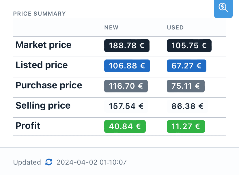 price summary présente les prix importants concernant le set ou la minifig en fonction de son état neuf ou occasion.